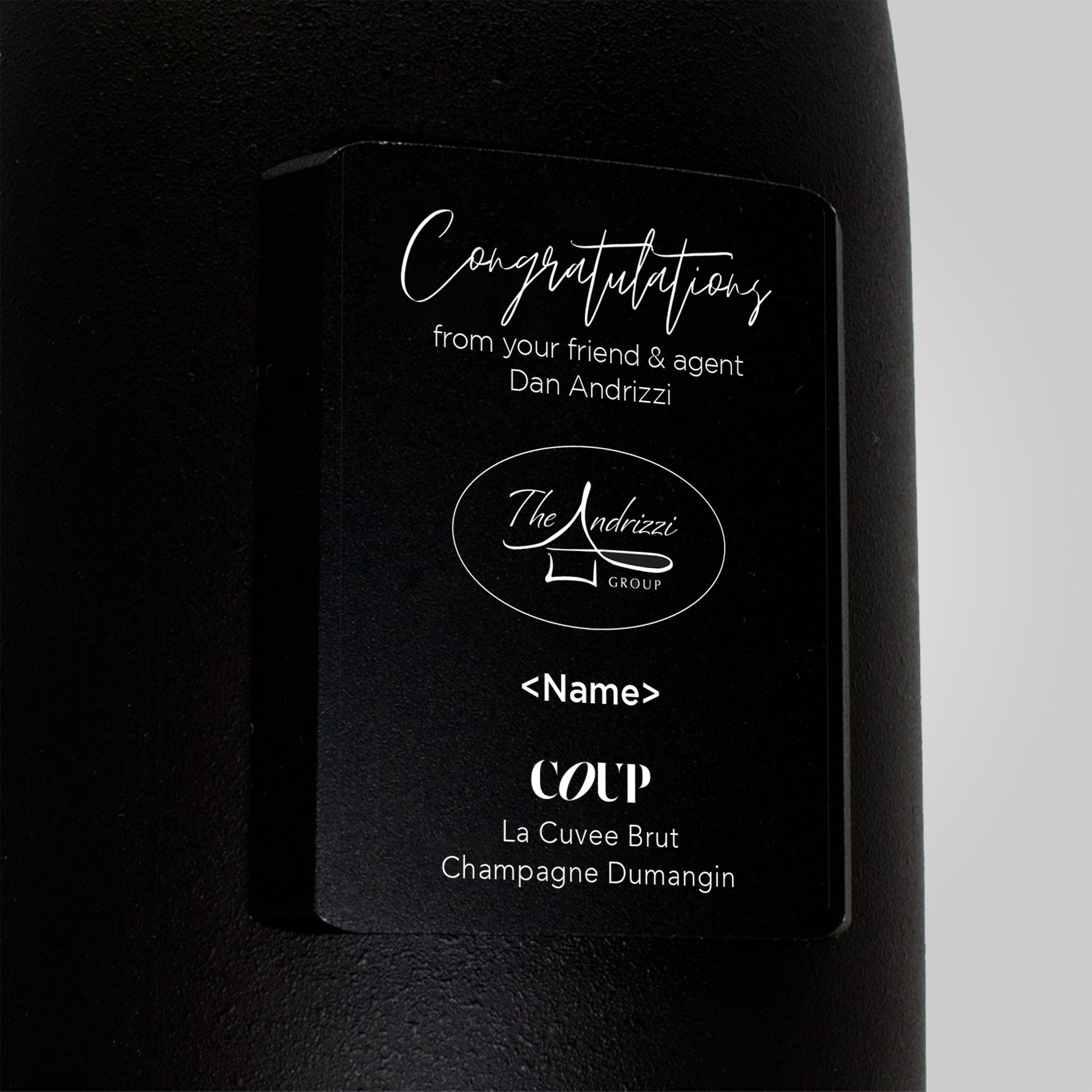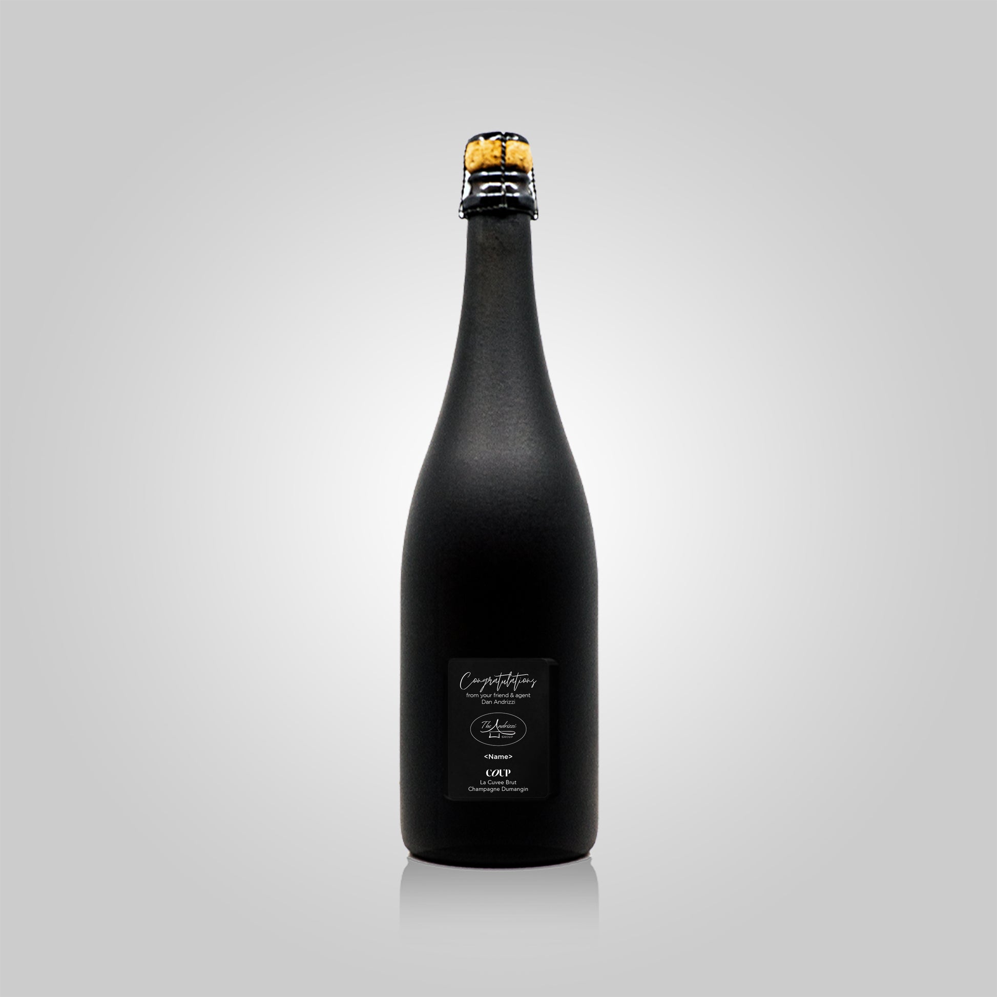 Laser-engraved black metal label. Hand painted matte black bottle.