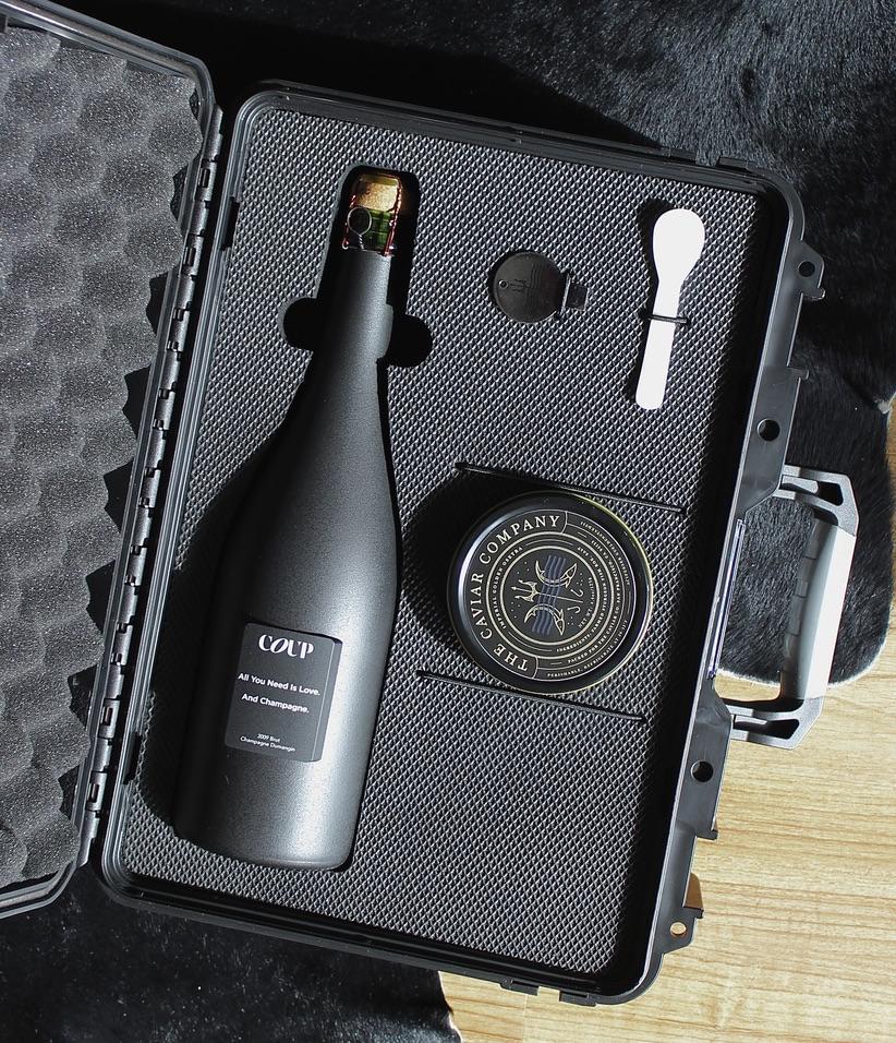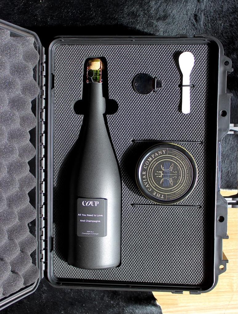 All you need is Love, Champagne.. and Caviar. Laser-engraved black metal label on a hand painted matte black bottle of 2009 Vintage Brut Champagne along with a 4.4 oz tin of Imperial Golden Osetra Caviar. Set in a hard shell gift case with laser cut foam, tin opener, and mother of pearl spoon.