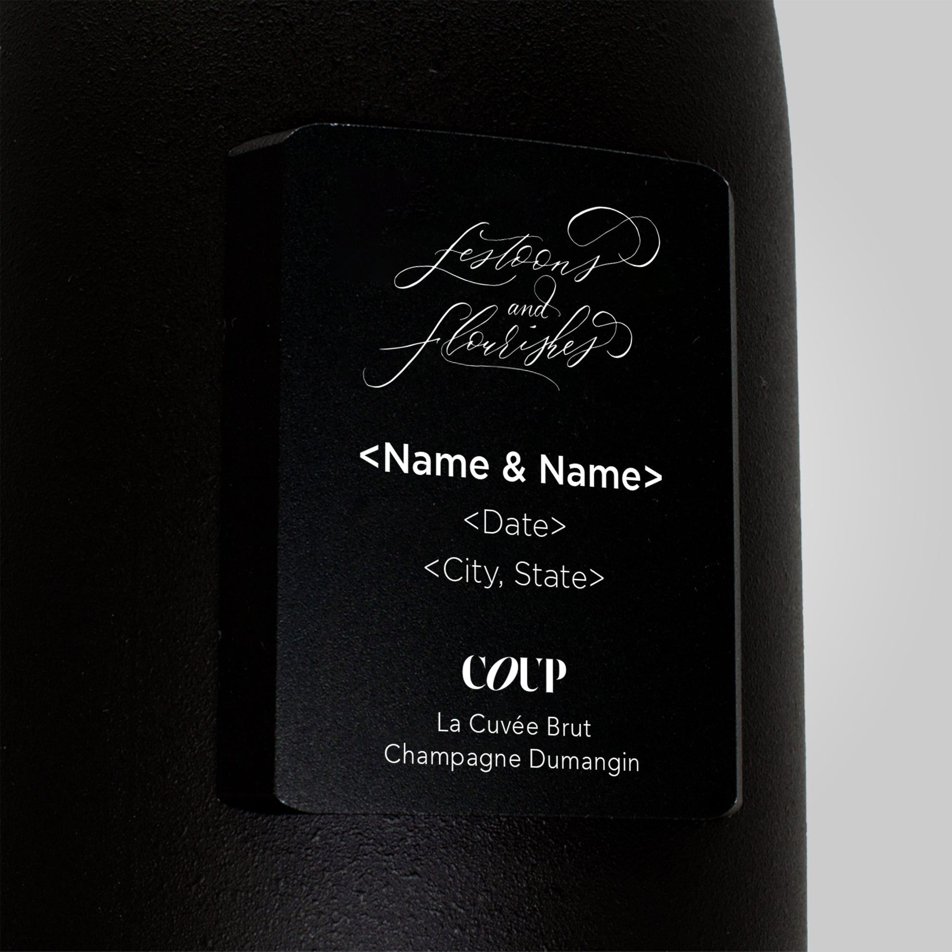 Laser-engraved black metal label. Hand painted matte black bottle.