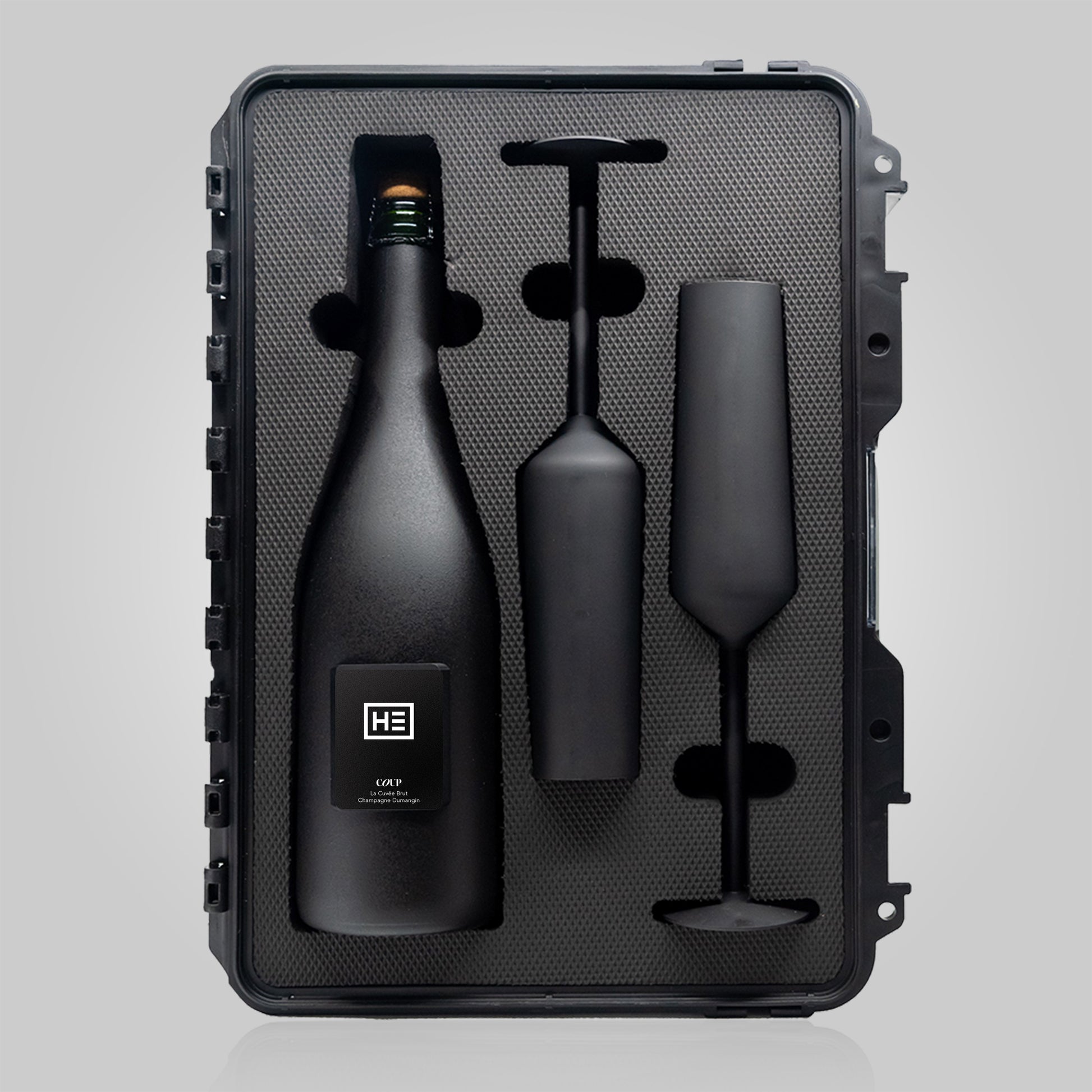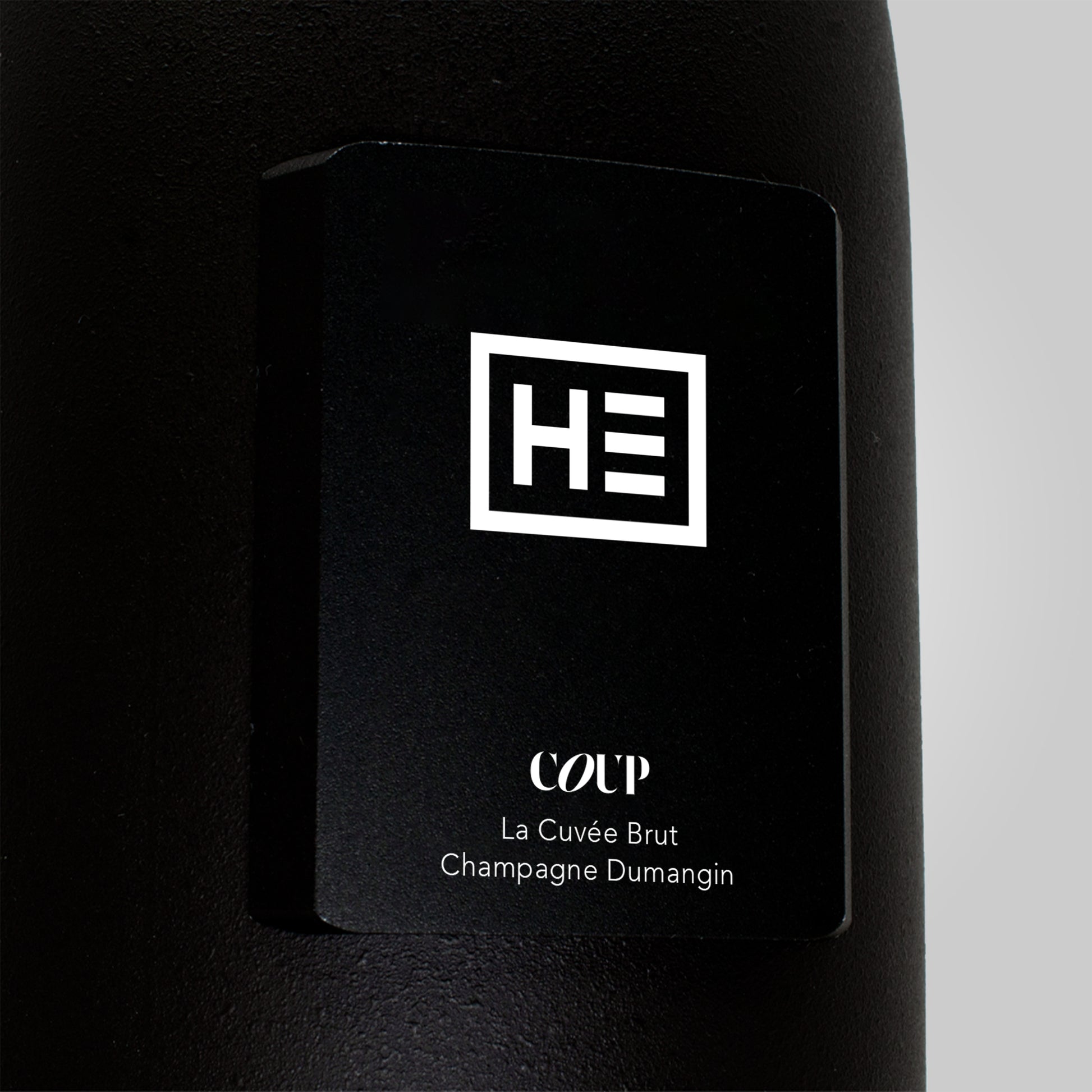 Laser-engraved black metal label. Hand painted matte black bottle.
