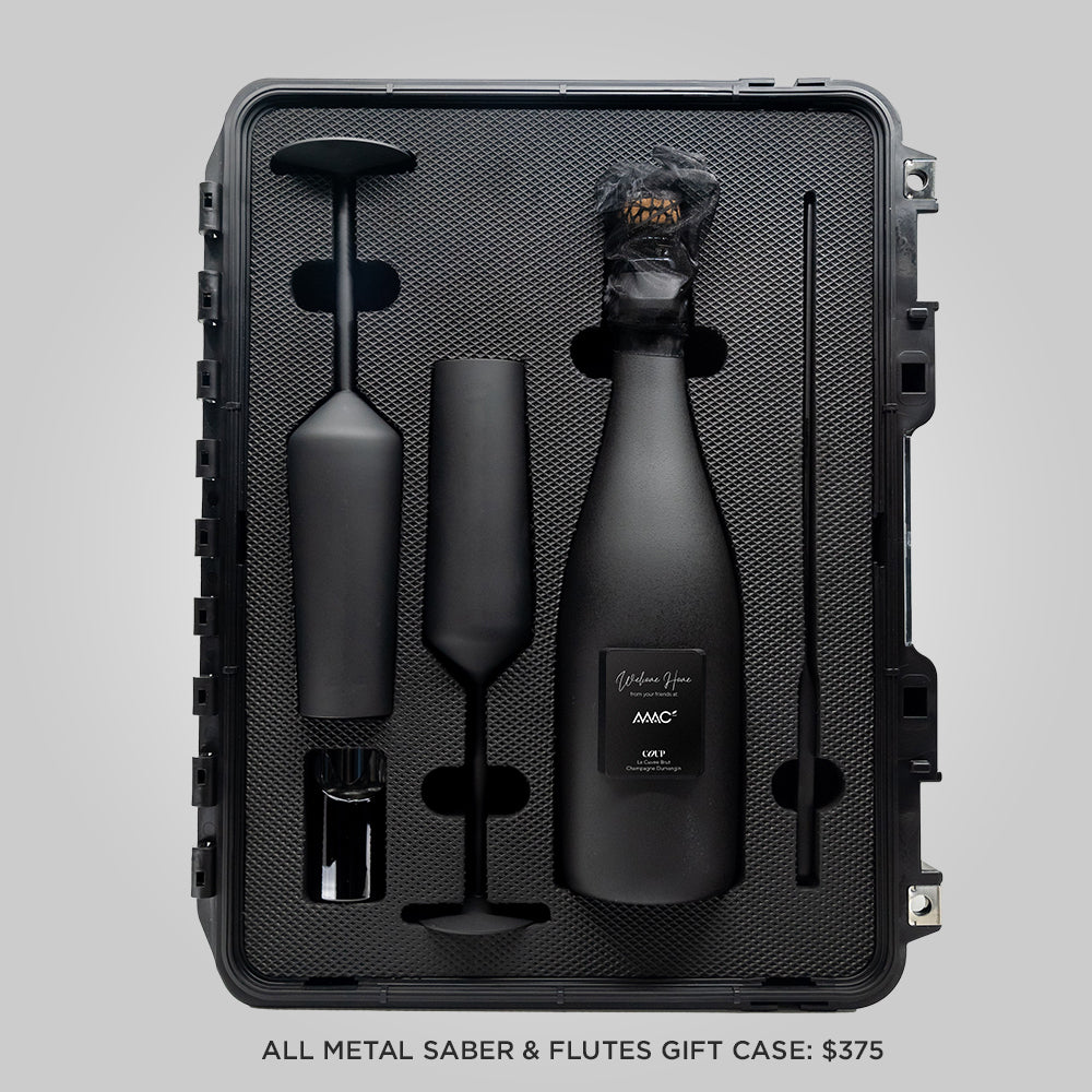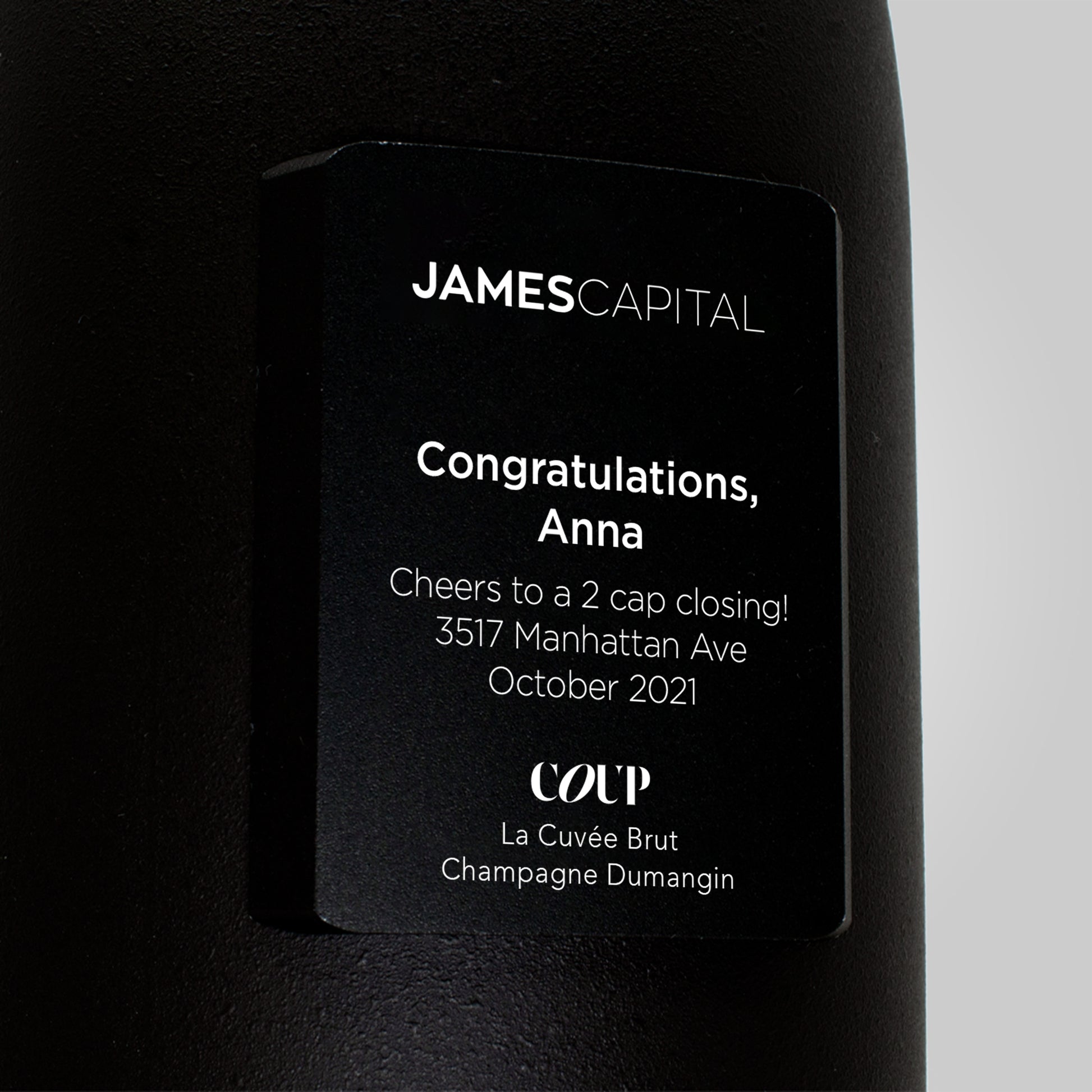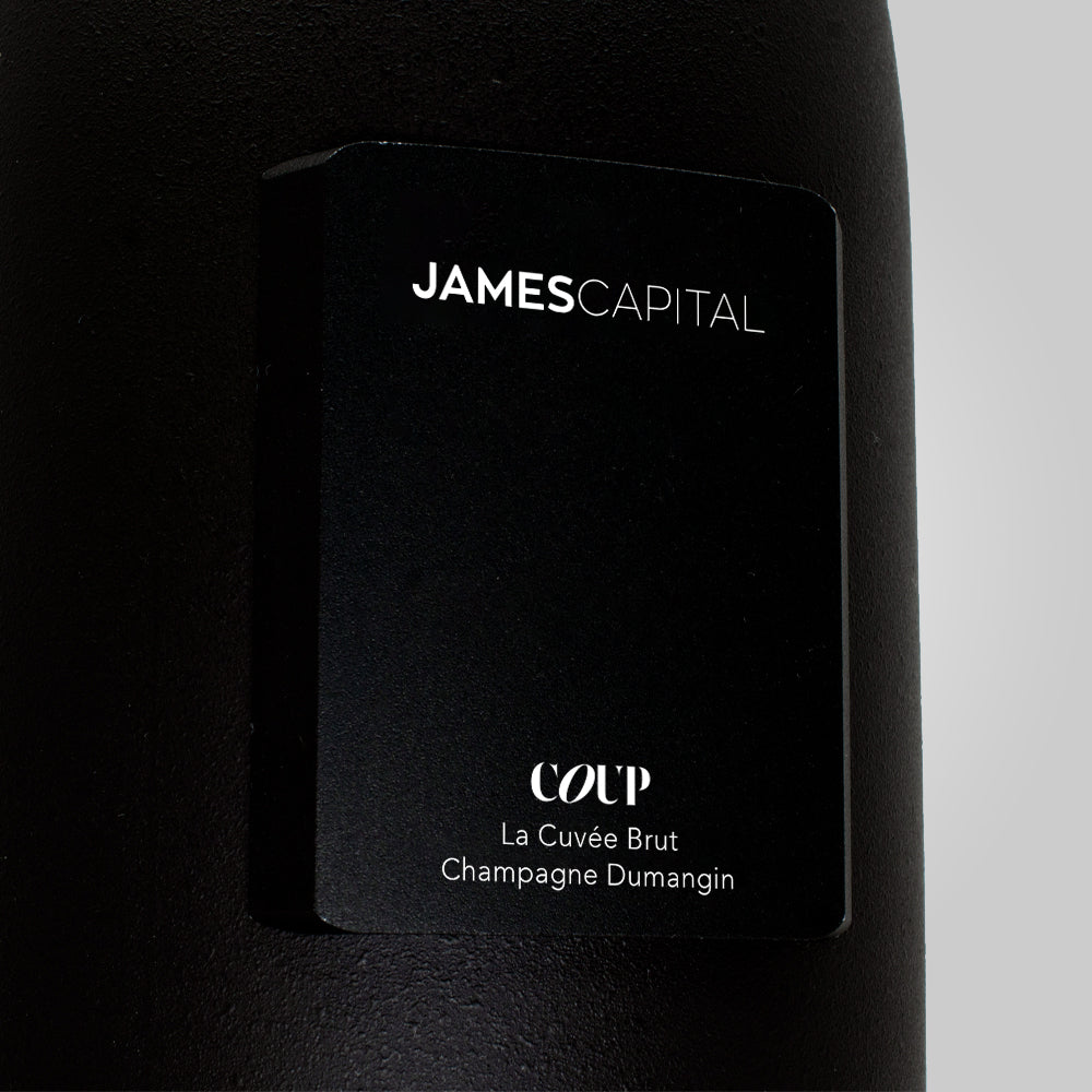 Laser-engraved black metal label. Hand painted matte black bottle.