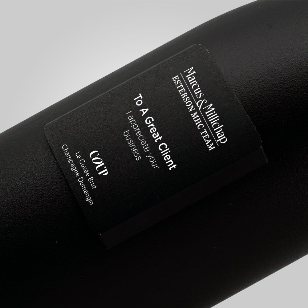 Laser-engraved black metal label. Hand painted matte black bottle.