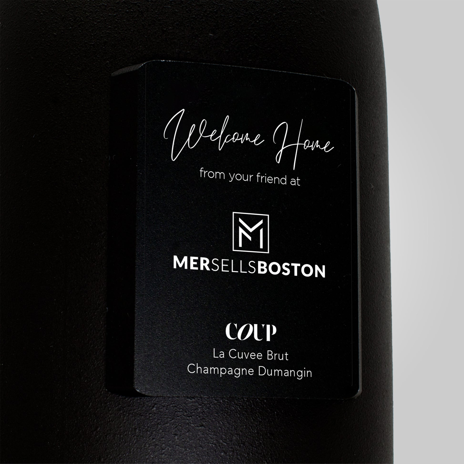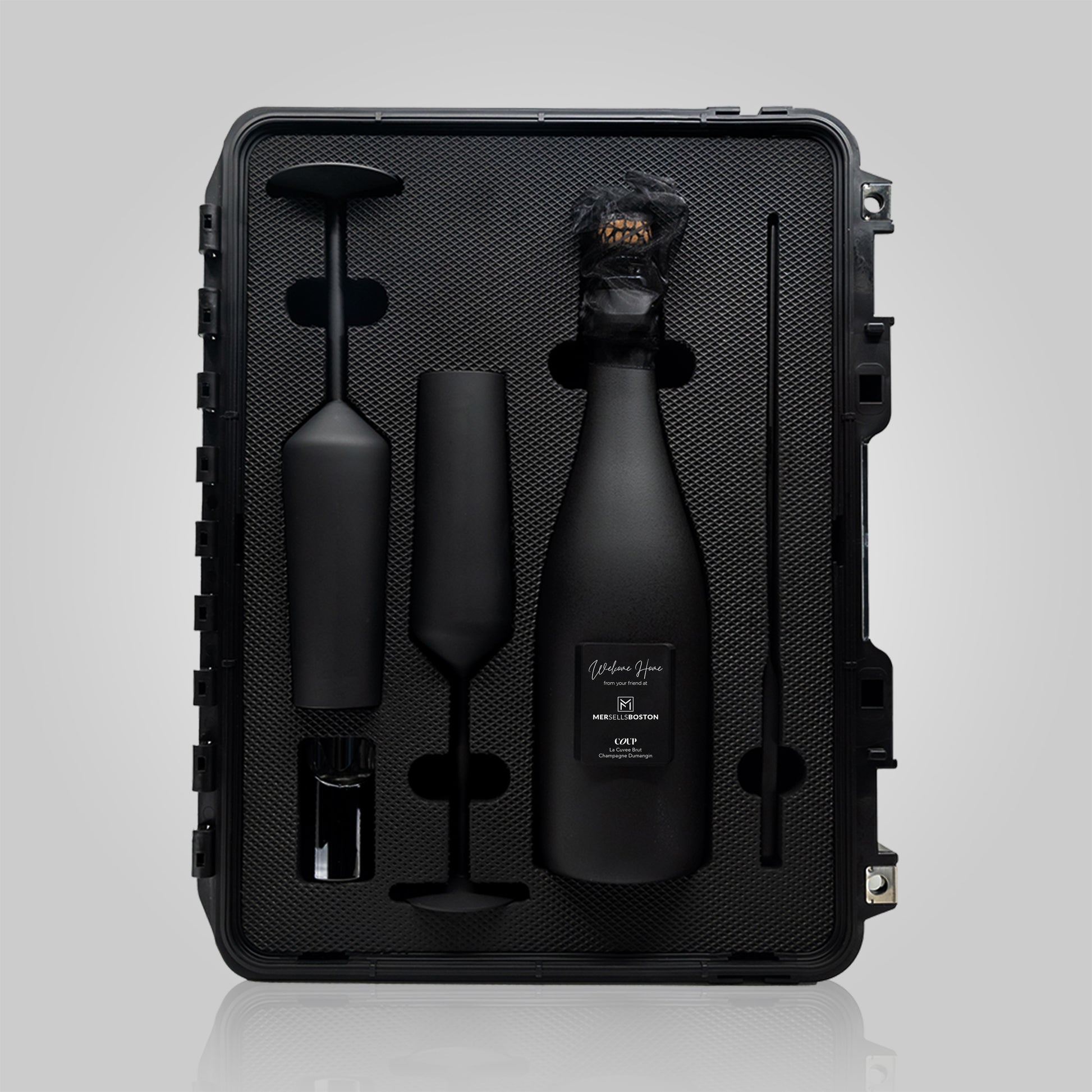 Laser-engraved black metal label. Hand painted matte black bottle.