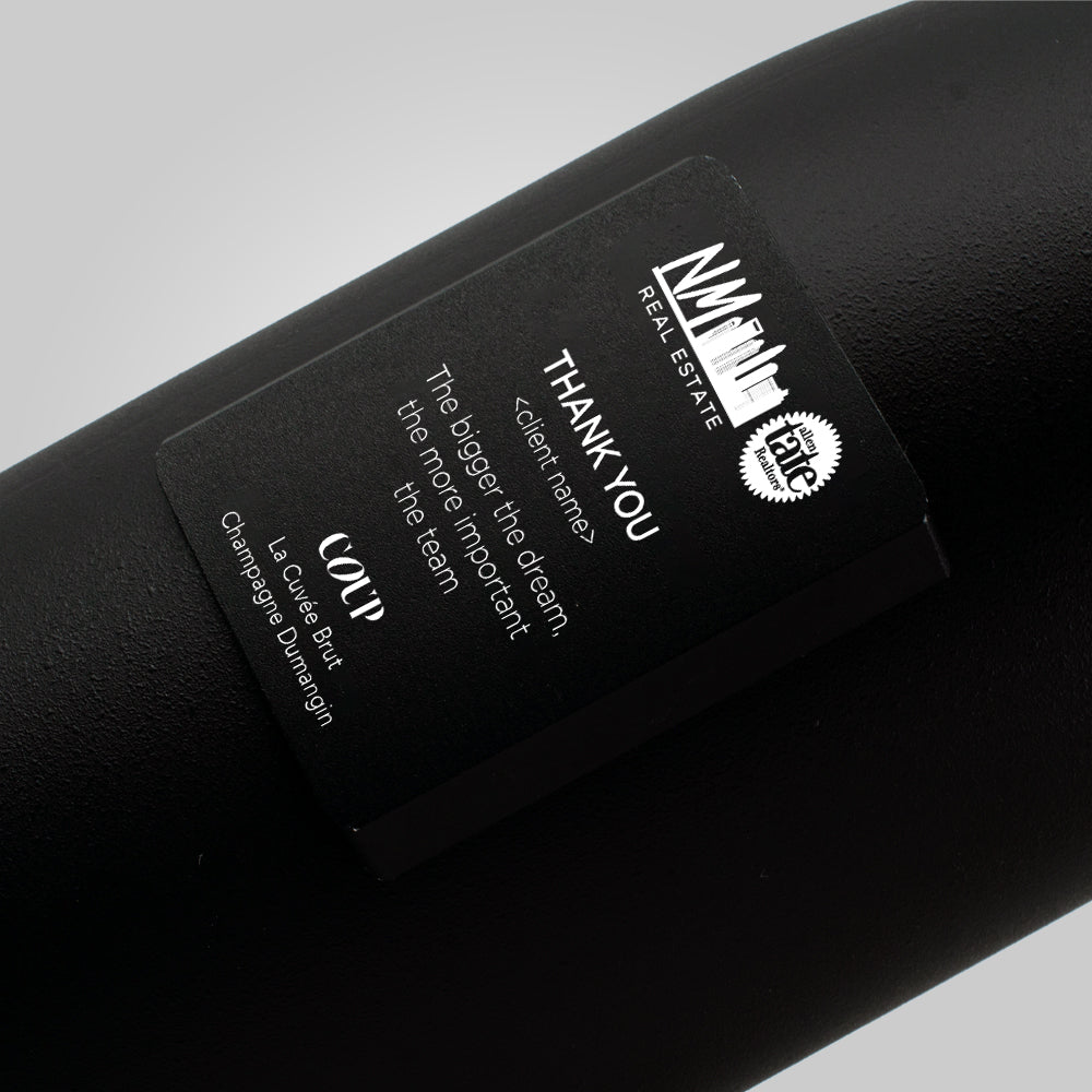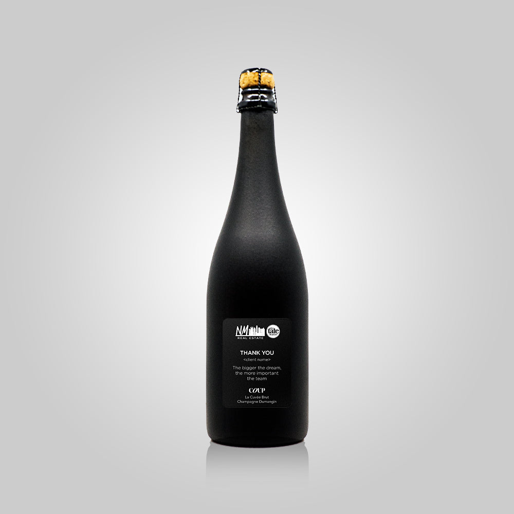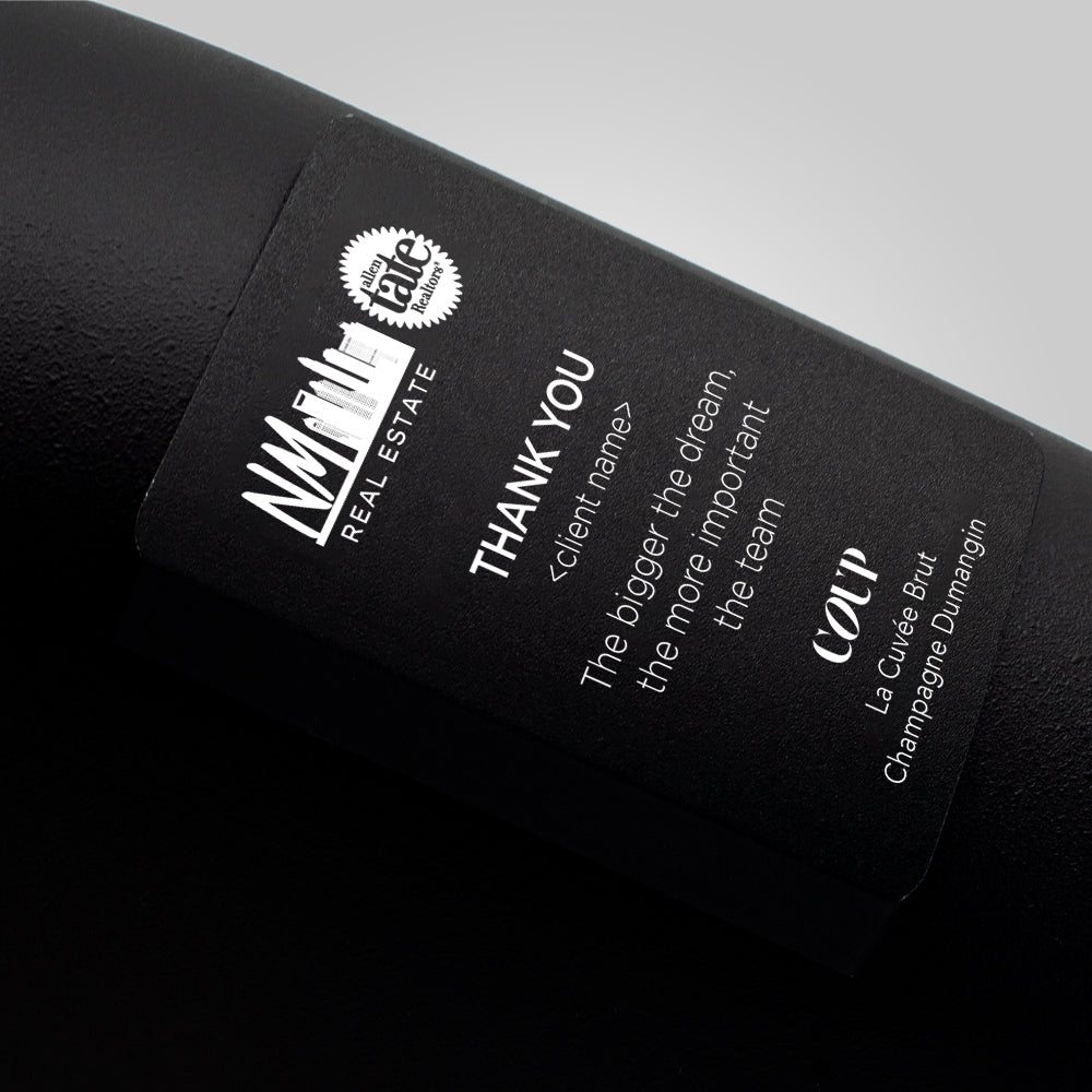 Laser-engraved black metal label. Hand painted matte black bottle.