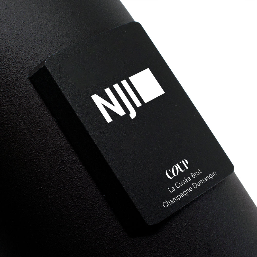 Laser-engraved black metal label. Hand painted matte black bottle.
