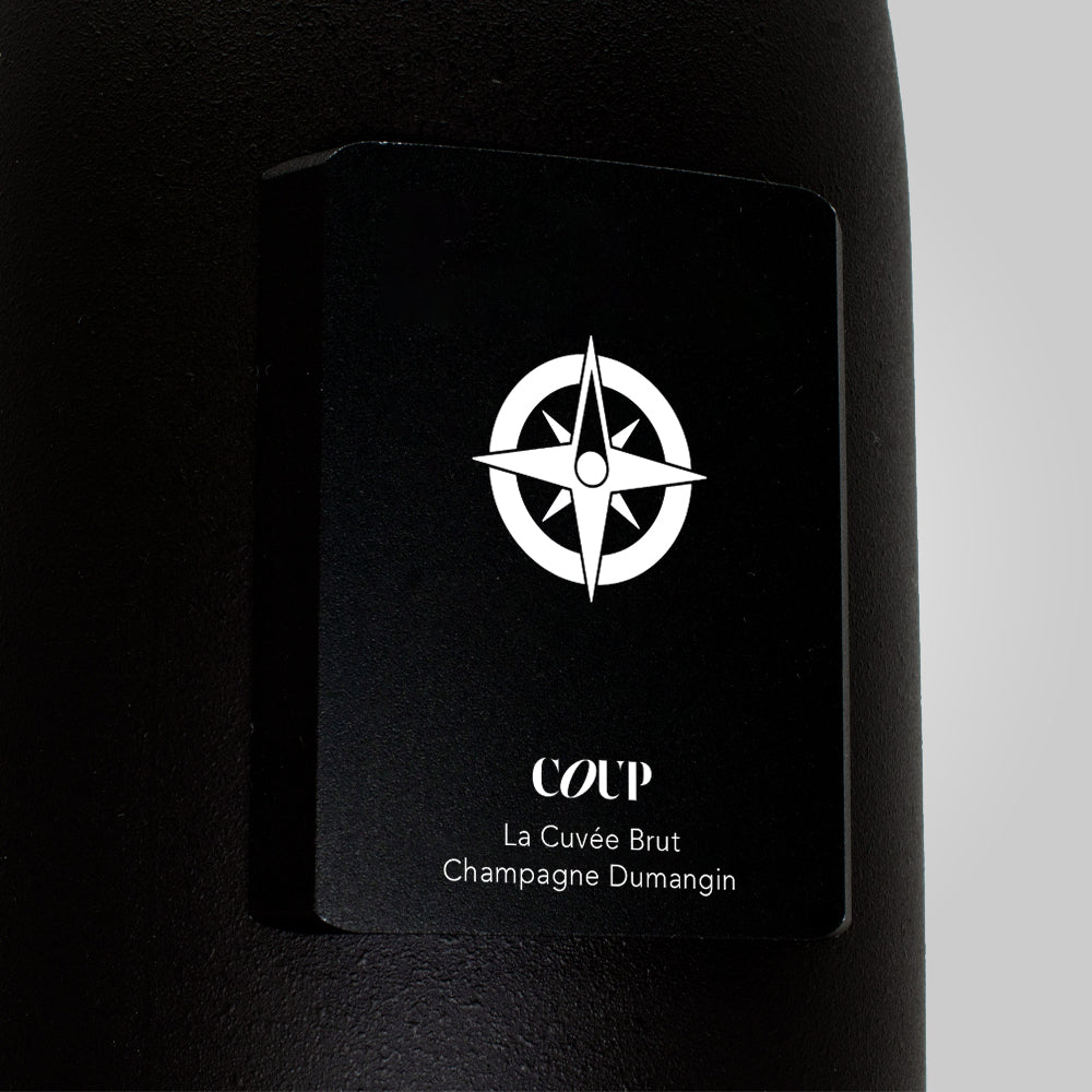Laser-engraved black metal label. Hand painted matte black bottle.