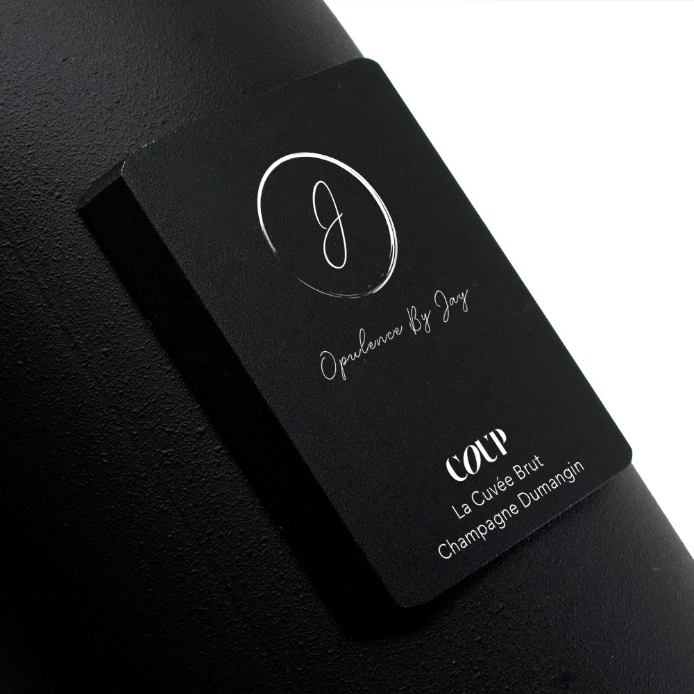 Laser-engraved black metal label. Hand painted matte black bottle.