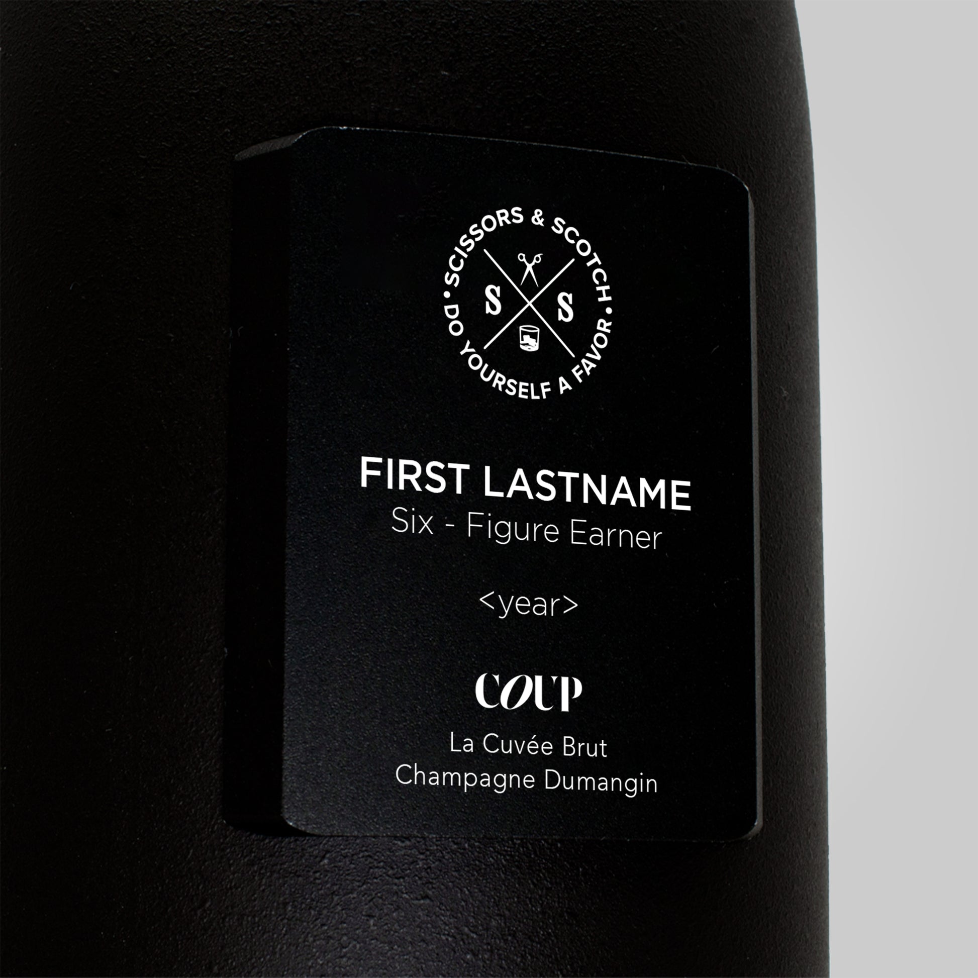 Laser-engraved black metal label. Hand painted matte black bottle.
