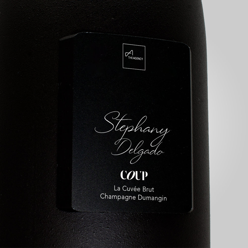 Laser-engraved black metal label. Hand painted matte black bottle.