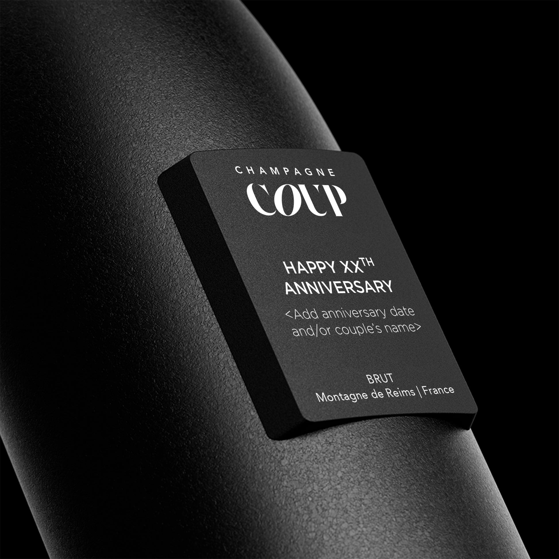 Happy XXth Anniversary - Custom Laser-engraved black metal label. Hand painted matte black bottle.